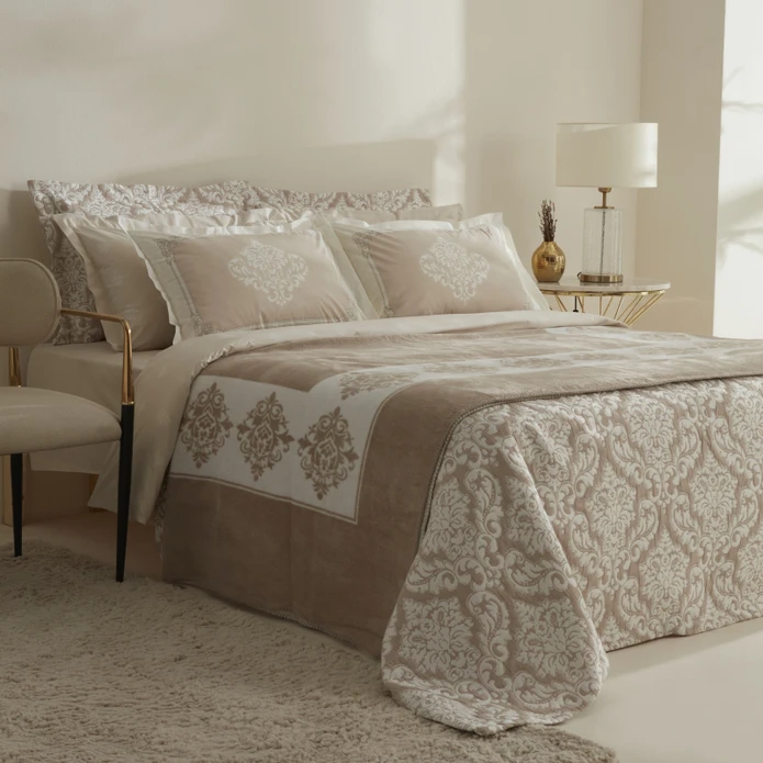 محتویات روکش لحاف طرحدار: ۲۰۰ سانتیمتر در ۲۲۰ سانتیمتر ملحفه: ۲۴۰ سانتیمتر در ۲۶۰ سانتیمتر روبالشی چیندار: ۵۰ سانتیمتر در ۷۰ سانتیمتر (۲ عدد) روتختی: ۲۶۰ سانتیمتر در ۲۷۰ سانتیمتر روبالشی روتختی: ۵۰ سانتیمتر در ۷۰ سانتیمتر (۲ عدد) پتو اسپانیایی: ۲۰۰ سانتیمتر در ۲۲۰ سانتیمتر جنس: روکش لحاف: نخ ۵۲، رنفورس، ۱۰۰٪ پنبه روتختی: ۱۰۰٪ PES روتختی: ۱۰۰٪ اکریلیک